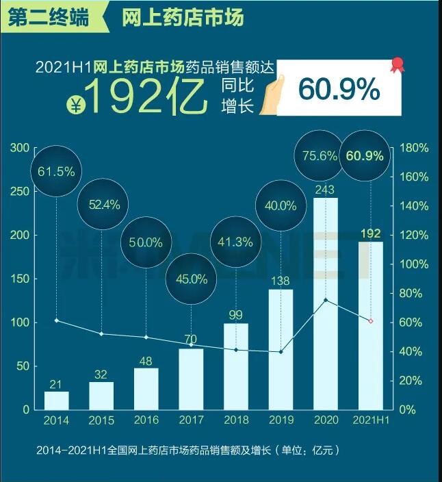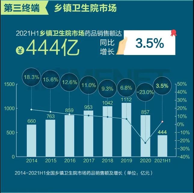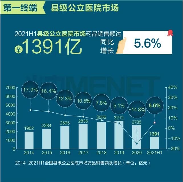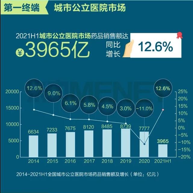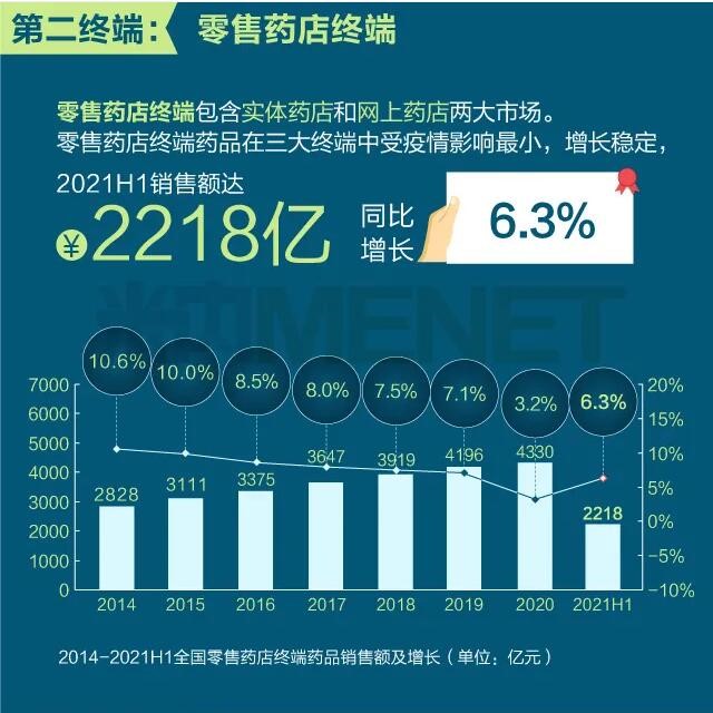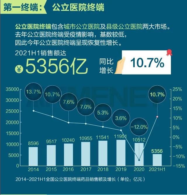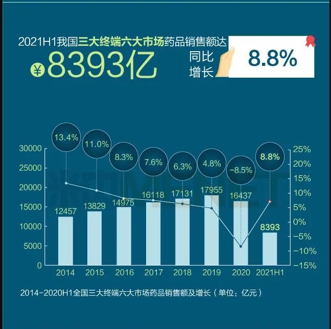 2021年上半年我國(guó)三大終端六大市場(chǎng)(定義范圍詳見文末“數(shù)據(jù)說明”)藥品銷售額達(dá)8393億元,同比增長(zhǎng)8.8%。從實(shí)現(xiàn)藥品銷售的三大終端的銷售額分布來看,公立醫(yī)院終端市場(chǎng)份額最大,2021上半年占比為63.8%;零售藥店終端市場(chǎng)份額2021上半年占比為26.4%;公立基層醫(yī)療終端市場(chǎng)份額2021上半年占比為9.8%。以上統(tǒng)計(jì)數(shù)據(jù)未包含“民營(yíng)醫(yī)院、私人診所、村衛(wèi)生室”。